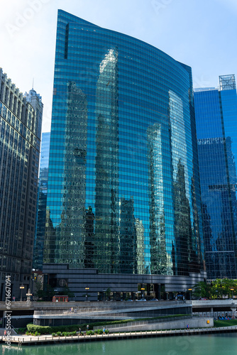 Fototapeta premium Chicago Riverwalk, Skyscraper with Reflections