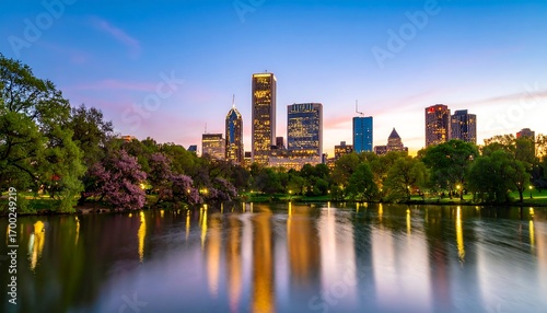 © Lampungg, Fototapeta premium Chicago skyline at dusk reflected in a park pond