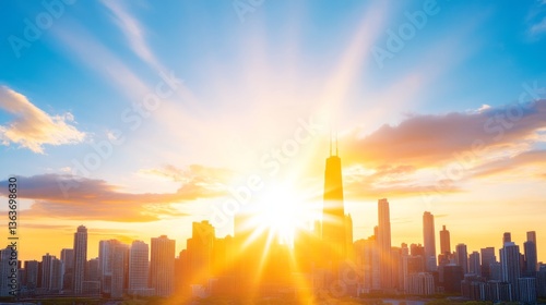Naklejka premium Chicago skyline at sunset illuminated by bright golden sunlight