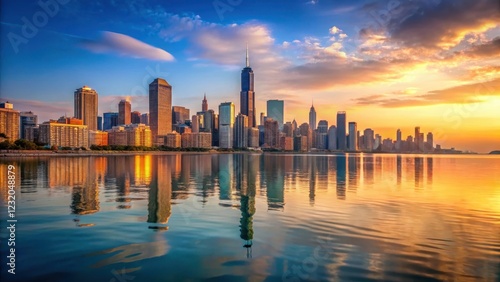 Fototapeta premium Chicago Skyline at Sunset Over Lake Michigan, reflection, tranquil, reflection, tranquil, serenity, American city