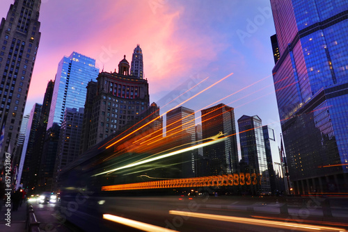 © Lane Erickson, Fototapeta premium Chicago Skyline of Buildings with Sunset and Car Traffic Driving By on Michigan Avenue
