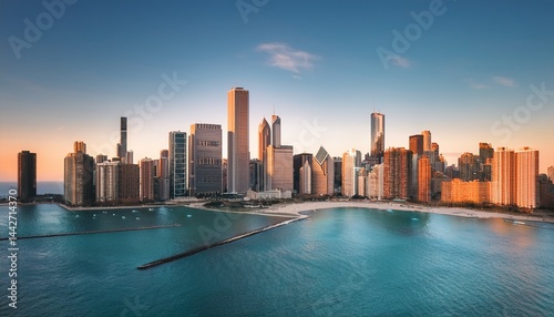 © background , Naklejka premium Chicago Skyline Sunset Lake Michigan Cityscape, Golden Hour Skyscrapers