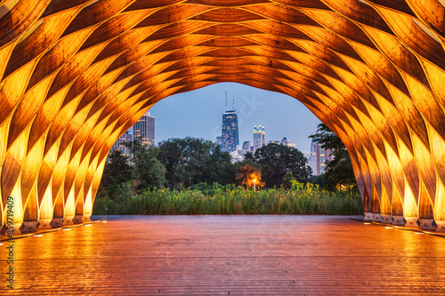 Obraz premium Chicago Skyline through Wooden Arch in Lincoln Park