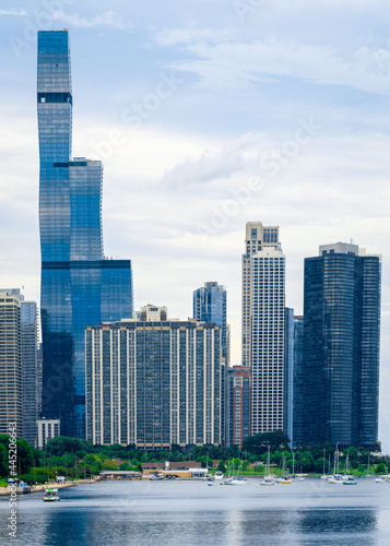 © sam, Obraz premium Chicago skyline with boats on Lake Michigan