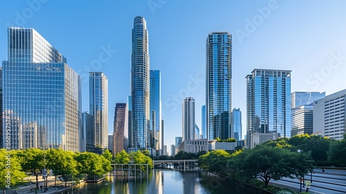 © AgungRikhi, Fototapeta premium Chicago Skyline with Lush Greenery and Reflective Water