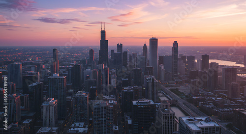 © Anton Tyrone, Fototapeta premium Chicago Skyline with Peach and Light Purple Sunset 3D Cityscape for Modern Wallpapers