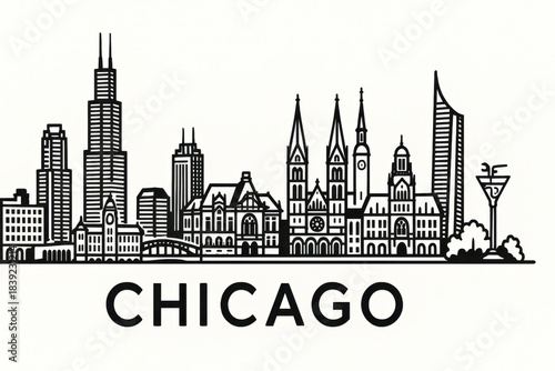 Naklejka premium Chicago. USA Panorama.black and white logo illustration