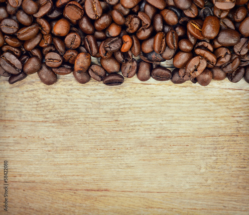 © Ettore, Obraz premium Chicchi di caffe su tavola di legno