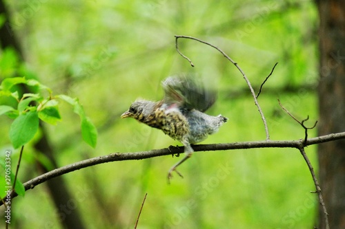 © irinashamanaeva, Fototapeta premium Chick-fledglings of the thrush on a branch of larch. Young mistle thrush stood for masking.