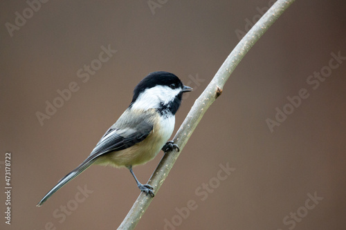 © Don Mroczkowski, Naklejka premium chickadee on a branch, song bird preached on a branch in winter.