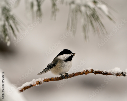 © Aline, Fototapeta premium Chickadee Photo. Image. Perched on a branch with snow and blur background with open beak and enjoying its environment and habitat in the winter season.