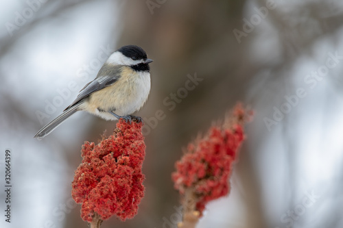 © Don Mroczkowski, Naklejka premium Chickadee Songbird standing on top of a staghorn sumac tree.