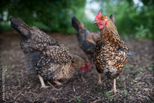 © antonivano, Fototapeta premium Chicken breed Kuchinskaya-anniversary looking in the frame, and the other chicken walking near and looking for food in the old straw. Two beautiful, colorful chickens roam freely in the yard