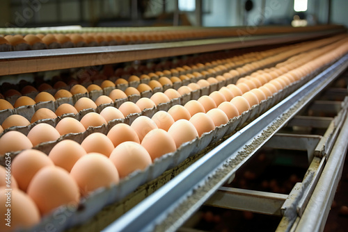Fototapeta premium Chicken eggs move along a conveyor in a poultry farm. Food industry concept,...