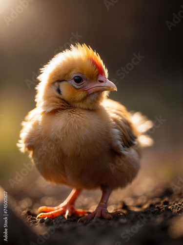 © Oleg, Obraz premium Chicken. Generative AI. Small yellow fluffy chicken on a dark background. Illustration AI