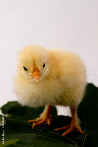 © Kateryna, Fototapeta premium Chicken on a grape leaf looking at the camera