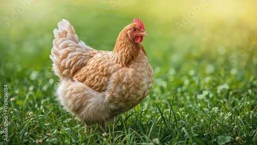 © Lasvu, Fototapeta premium Chicken on the green grass