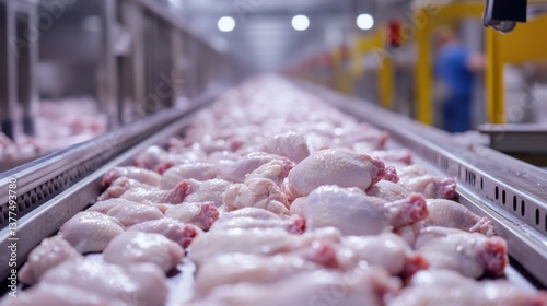 © BlackLion, Fototapeta premium Chicken processing line with raw poultry on conveyor belt in industrial facility during daytime operations