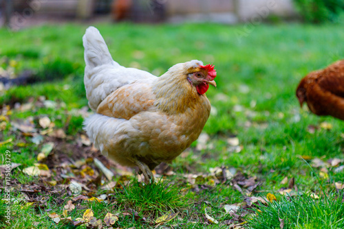 Fototapeta premium Chicken Standing on Grass with Fallen Leaves