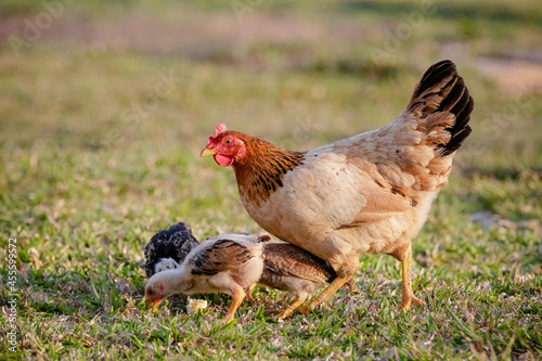 © Luis Lima Jr, Fototapeta premium Chickens eating bush of various types and sizes on the grass in the field.