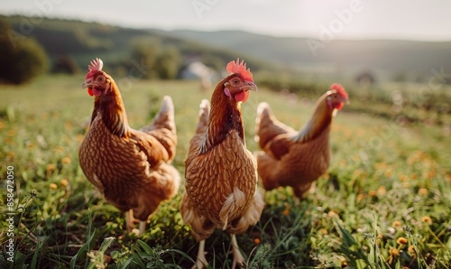 Fototapeta premium Chickens Grazing in Green Pasture on a Sunny Day