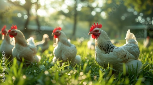 © Bandaro, Fototapeta premium Chickens grazing on a green field