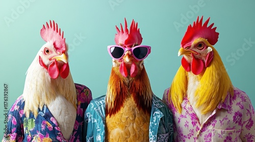 Fototapeta premium Chickens in trendy and colorful clothing, set against a solid pastel background, creating a humorous and artistic visual for marketing