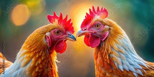 © chaowalit, Fototapeta premium Chickens Kissing - Farm Animals Romance