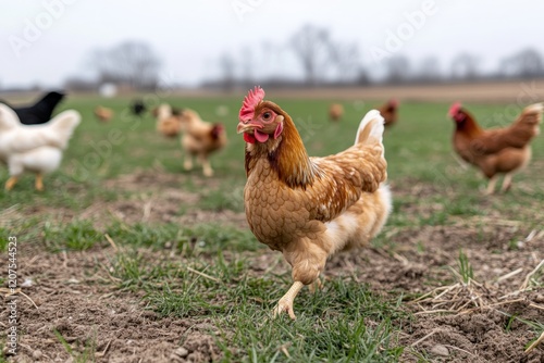 Fototapeta premium Chickens roam freely in lush green pastures, representing farm life,...