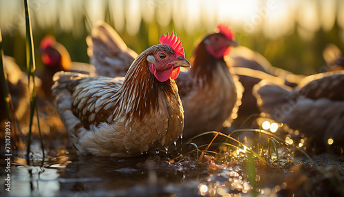 Naklejka premium Chickens roam freely in the green meadow generated by AI