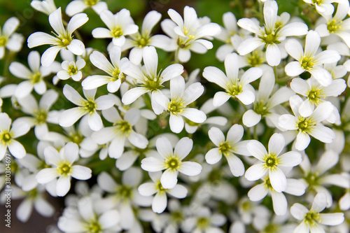 Obraz premium Chickweed blooms macro in the garden outdoors (Cerastium uralense)