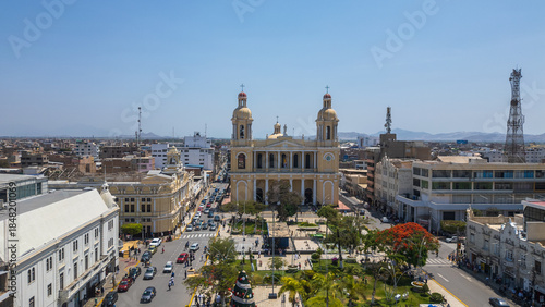 © Gino Tuesta, Obraz premium Chiclayo’s Main Square featuring the iconic Cathedral, central fountain, green gardens, and a lively urban atmosphere that reflects the cultural and social heart of the city in northern Peru