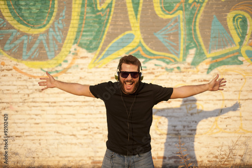 © laviejasirena, Obraz premium Chico atractivo y joven ecuchando música con auriculares, sonriendo y cantando