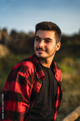 © MiguelAngelJunquera, Obraz premium Chico joven con camisa roja estilo leñador en parque natural cerro del hierro,sevilla
