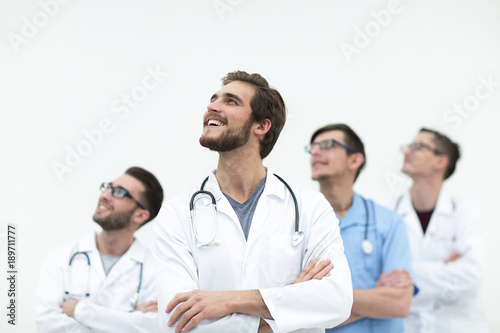 © ASDF, Fototapeta premium chief physician and colleagues looking at copy space