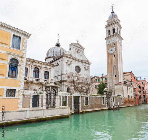 Fototapeta premium Chiesa di San Giorgio e Chesi and Bell Tower Along a Venetian Canal