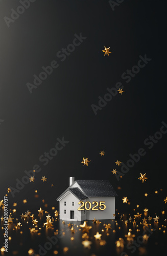 © Noble Nature, Fototapeta premium "2025" chiffres dorés avec une maison blanche stylisée et étoiles dorées, illustration festive pour agence immobilière sur fond noir avec espace négatif copyspace nouvel an