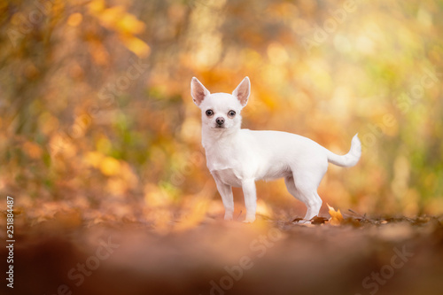 © Leoniek, Fototapeta premium Chihuahua dog sitting in an autumn forest lane with sunbeams