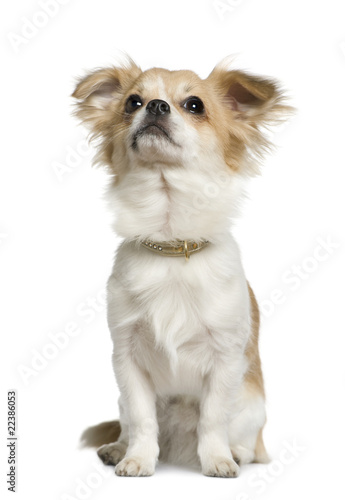 Obraz premium Chihuahua, 10 months old, sitting in front of white background