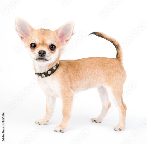 Obraz premium Chihuahua puppy with black leather studded collar on white