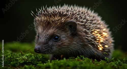 © Tran, Fototapeta premium 小さなハリネズミ 柔らかな光に包まれ輝く夜 (Chiisana harinezumi yawarakana hikari ni tsutsumare kagayaku yoru) This translates roughly to: "Small hedgehog, shining night enveloped in soft light.". AI Generated
