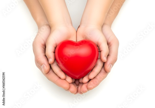 © Sabid, Fototapeta premium Child and adult hands holding a red heart together
