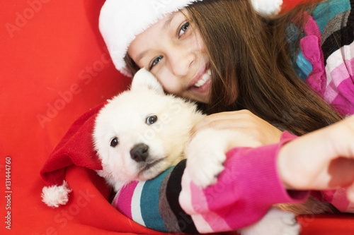 © Happy monkey, Fototapeta premium child and puppy in Christmas hat