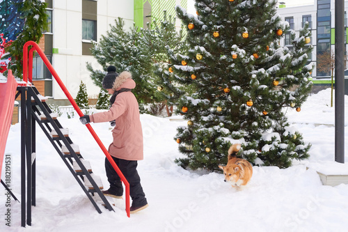 © khmelev, Fototapeta premium Child climbing stairs in snowy park with dog
