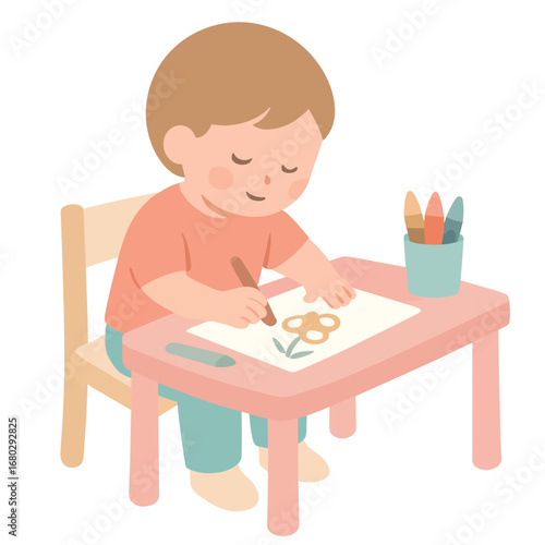 © Ramu888, Naklejka premium Child coloring book at small table, cute 2D flat vector illustration