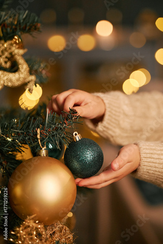 © Seventyfour, Fototapeta premium Child decorating Christmas tree, holding gold and green ornaments with both hands, focusing on placing bauble on branch, festive lights softly glowing in background