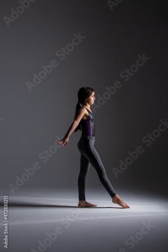 Obraz premium child doing artistic gymnastics movements, wearing gym clothes, photography taken in a studio