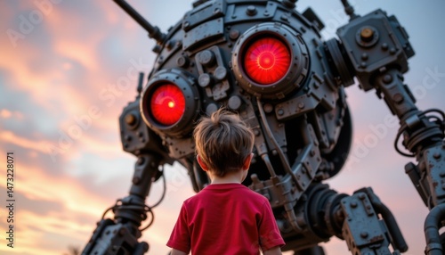 © Angelo, Fototapeta premium Child encounters futuristic robot urban landscape photography sunset dramatic perspective imagination and technology