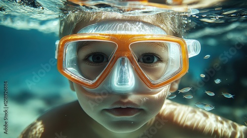 Fototapeta premium Child enjoys underwater exploration while snorkeling in clear ocean water,...