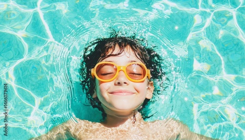 © Scroopt, Naklejka premium Child floating in pool, enjoying summer